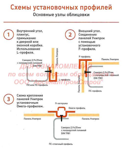 Монтаж панели осуществляется при помощи установочных декоративных Омега-профиля, F-профиля, L-профиля, которые также являются негорючими согласно ТКП 45-2.02-315-2018.