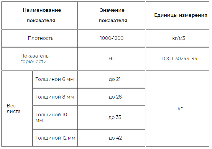 Показатель плотности и вес плит в зависимости от толщины приведен в таблице ниже: